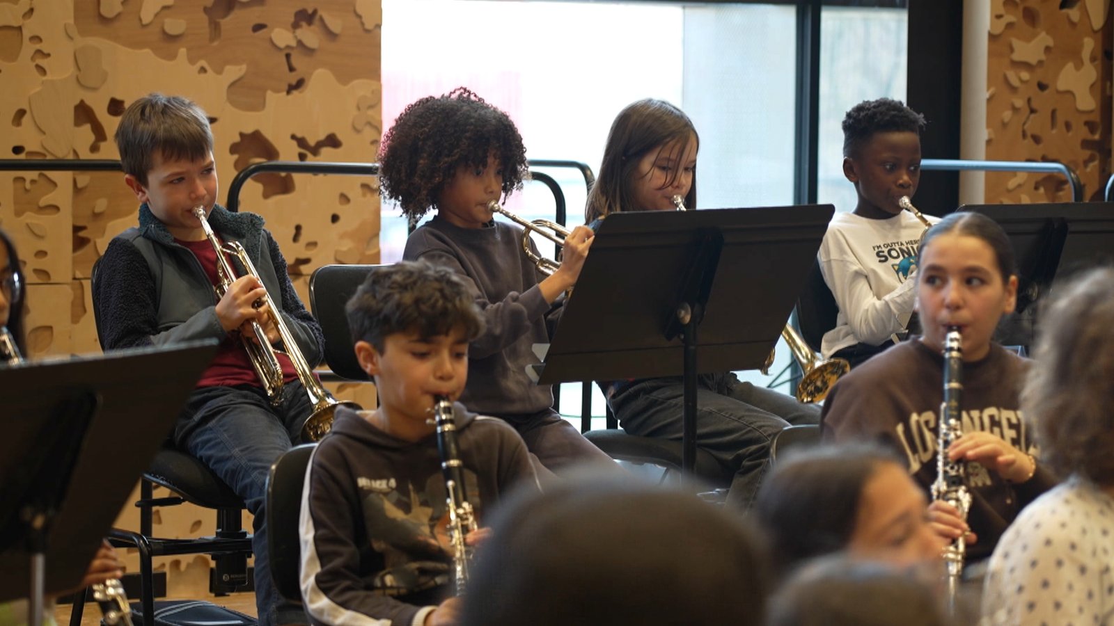 In Neuilly-sur-Marne, young children have a powerful moment receiving their musical instruments. For families, this instrument distribution is a source of pride and emotion. The children will keep their instruments for three years, attending weekly workshops to learn collective music practice and form a symphonic orchestra. At the end of the year, all students will perform on stage at the Philharmonie de Paris. During a Démos workshop, children explore music through singing, dancing, and rhythm before even playing an instrument. Caractéristique spécifique du programme : tous les cours sont dispensés en groupe et suivent une approche pédagogique bienveillante, mettant l’accent sur l’écoute et la pratique orale.
