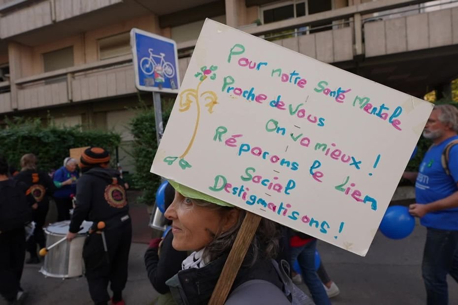 Bright blue balloons, posters, striking or quirky slogans, music… and a lot of kindness among the participants of this festive parade. Several dozen people marched through the streets of Lyon on Saturday, October 18th for the PsyParade. An initiative by the National Union of Families of Mentally Ill and/or Handicapped (UNAFAM 69). Schizophrenia, bipolar disorders, obsessive-compulsive disorders, attention disorders, treatment-resistant depression… People affected by mental health disorders are stepping out of the shadows, determined to no longer hide from the gaze of others.